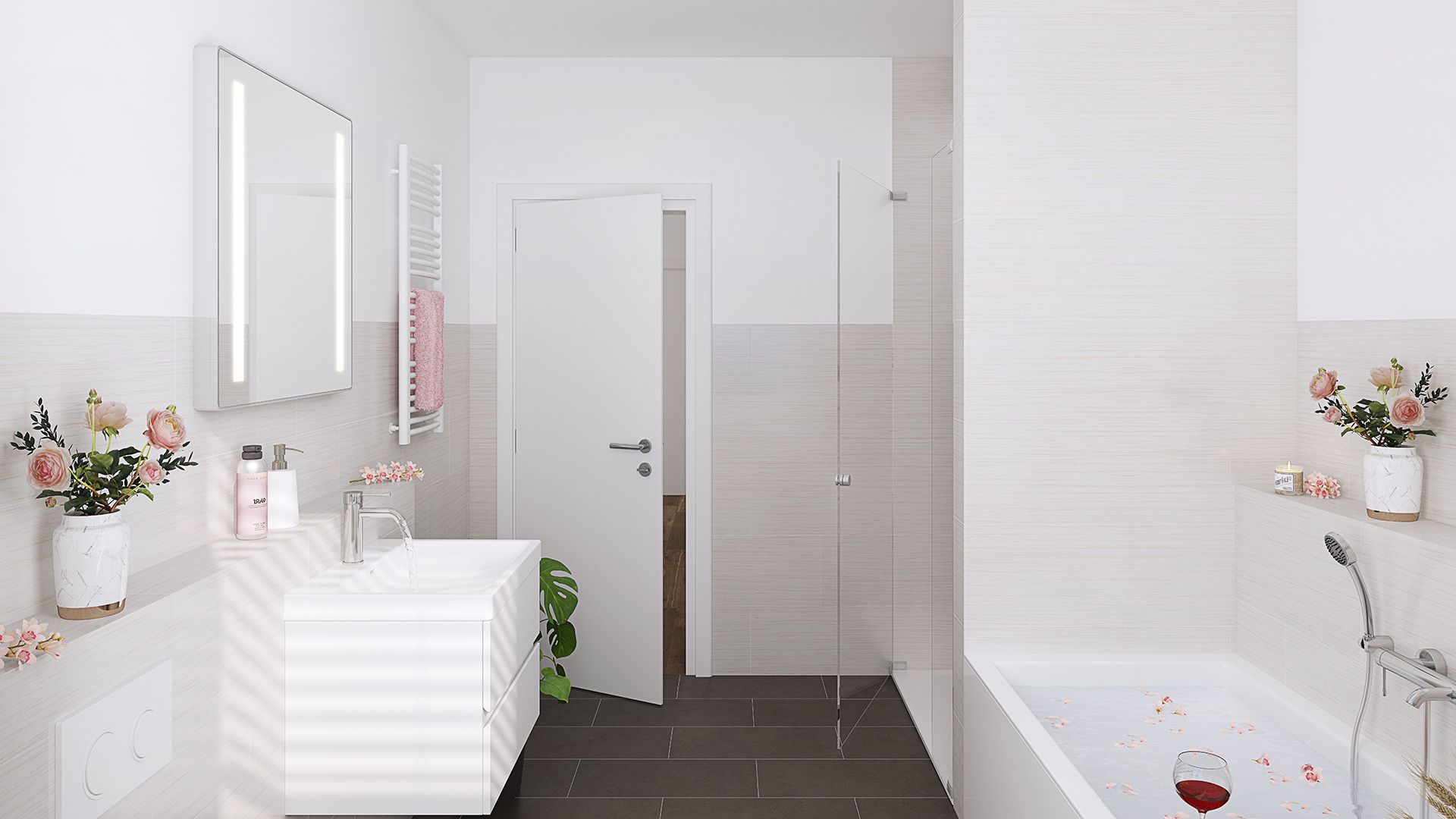 Das innenliegende Badezimmer mit ca. 7 m² ist ausgestattet mit einer Badewanne und einer separaten Dusche, die Ihnen vielfältige Möglichkeiten zur Entspannung bietet. Ein separates Gäste-WC sorgt für zusätzliche Flexibilität und ist besonders praktisch bei Besuch.