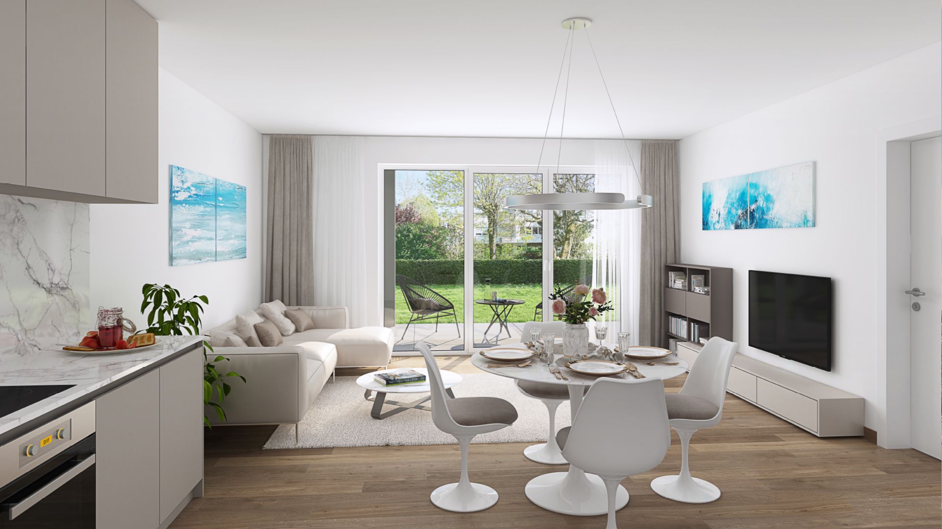 Die Innenausstattung der Wohnungen lässt keine Wünsche offen. Hochwertiger Design-Vinyl-Fußbodenbelag sorgt für eine moderne und pflegeleichte Oberfläche, während die strapazierfähigen Glasfasertapeten und die Kunststofffenster mit 3-fach-Verglasung für eine hohe Wohnqualität sorgen. Elektrische Rollläden und eine Fußbodenheizung gehören ebenso zur Standardausstattung wie eine moderne Videogegensprechanlage, die für zusätzliche Sicherheit sorgt.