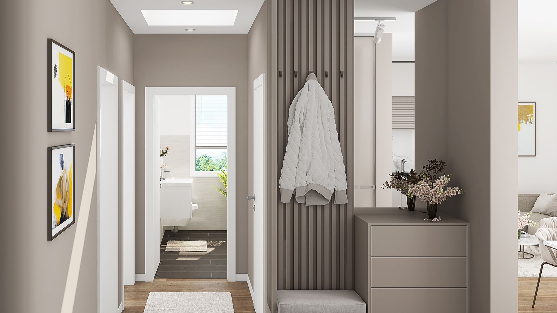 Das moderne Badezimmer (ca. 7,7 m²) überzeugt mit einer Badewanne und einer separaten Dusche. Ein zusätzliches Dusch-WC (ca. 3,8 m²) ergänzt den Komfort. Der praktische Flur (ca. 11 m²) verbindet die Räume effizient, und der Abstellraum (ca. 3,7 m²) sorgt für wertvollen Stauraum.